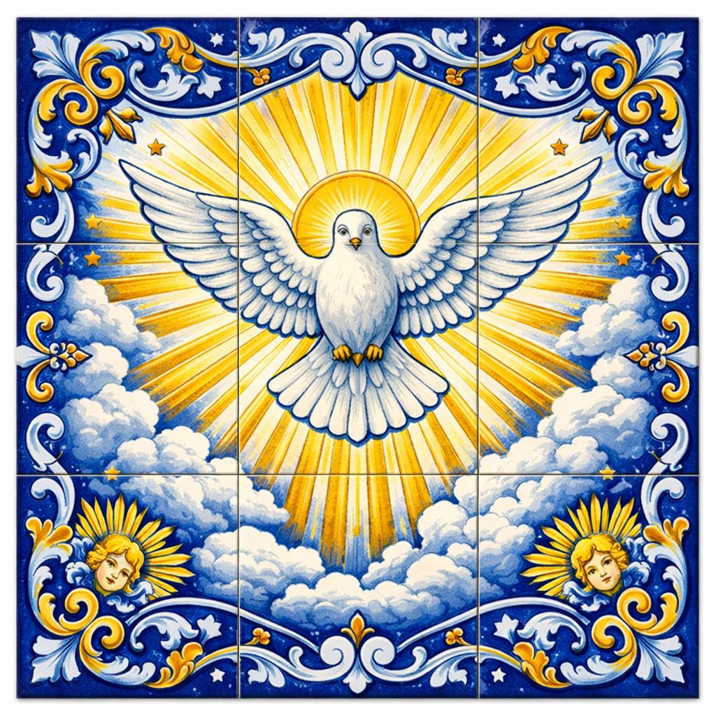 Ao centro, a pomba celestial abre suas asas sobre um céu iluminado, cercada por nuvens e elementos ornamentais clássicos em azul e dourado, que remetem à estética barroca dos antigos azulejos religiosos.