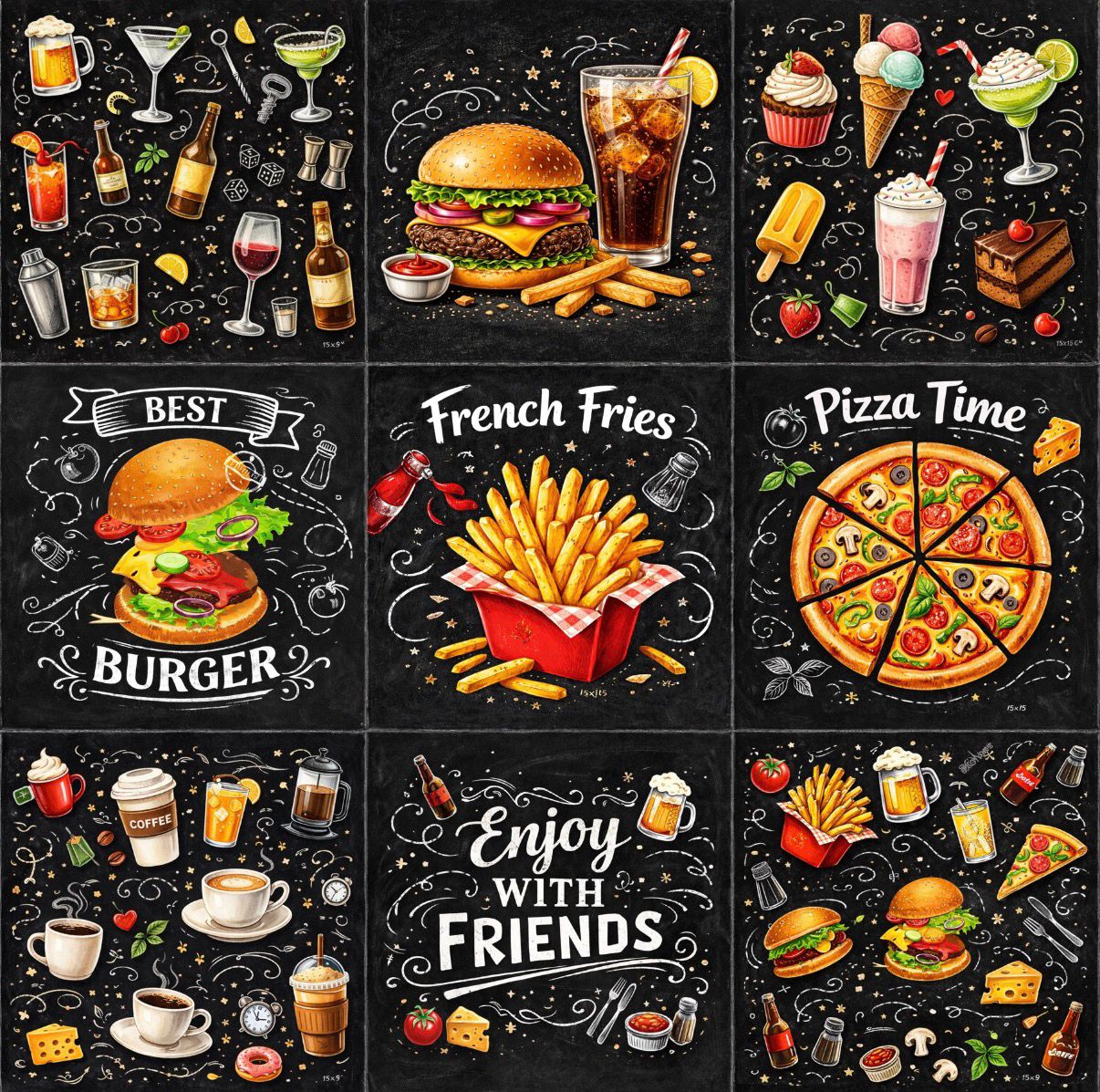 Inspirada no universo vibrante da gastronomia, esta linha de azulejos celebra os sabores e momentos que tornam a cozinha e os encontros à mesa ainda mais especiais. Com ilustrações de hambúrgueres, pizzas, bebidas, cafés, sobremesas e elementos de bar, cada peça traz um estilo moderno com fundo estilo lousa, lembrando os tradicionais menus de bistrôs, hamburguerias e cafés.